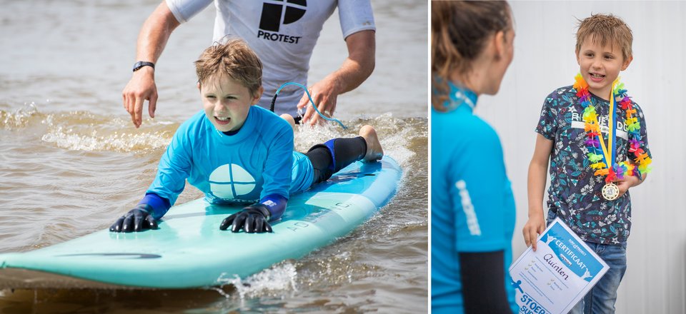 Deux semaines après cette première leçon inconfortable, Quinten lui-même est impatient de retourner à l'eau. « Lors de la remise des diplômes de surf, il a pris le micro et fait des blagues », explique Jantien. « C'était un autre enfant. »